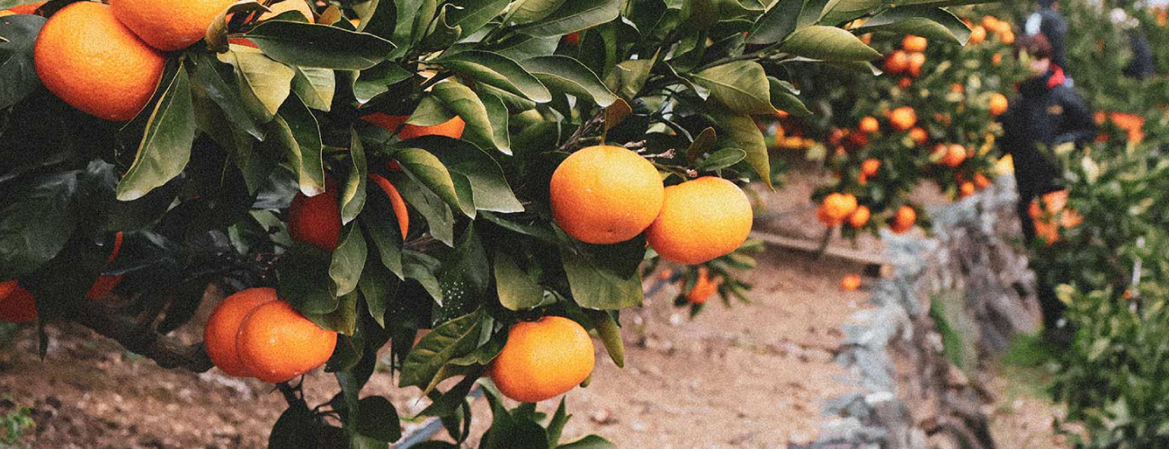 【マルチ栽培】 みかん園地全体の地面をシートで覆い、雨水での余分な水分が樹体に入らないようにした栽培方法。